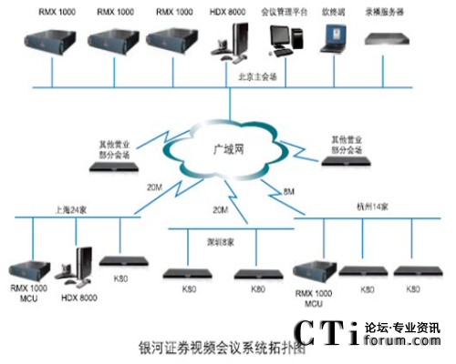 銀河證券視頻會議系統(tǒng)采用寶利通視頻會議產(chǎn)品,在銀河證券北京總部中心機房配備寶利通新一代實時媒體會議平臺 RMX 1000 MCU和高清錄播服務(wù)器;在上海和杭州也分別配置了RMX