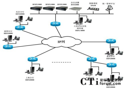 RMX1000作為多媒體多點(diǎn)處理單元,70臺HDX8006和HDX8002分布在全國各個分行作為視頻會議的接入,RSS2000服務(wù)器提供HD的會議錄制;65臺IP電話作為實時會議備份系統(tǒng);整個系統(tǒng)提供720P/60幀或1080P/30幀的會議畫面質(zhì)量,音頻達(dá)到22KHz寬帶音質(zhì),劇院級音質(zhì)享受,具備新一代高清雙流P