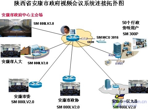 讓安康市政府尤為滿意的是,瑞福特的專業(yè)服務(wù)團(tuán)隊(duì),為其量身定制了最適合的解決方案:1臺(tái)MCU 3016視頻會(huì)議服務(wù)器放在機(jī)房;15臺(tái)視頻會(huì)議硬件終端SM880L部署在市中心會(huì)場以及各縣級(jí)政府會(huì)議室;50套軟件終端SM300安裝在PC和筆記本電腦上,輕松實(shí)現(xiàn)了安康市政府各項(xiàng)視頻會(huì)議應(yīng)用以及緊急事件的應(yīng)急指揮和溝通。