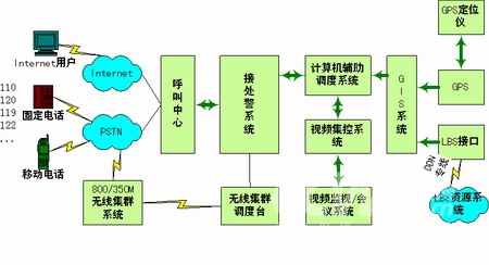 本系統(tǒng)實現接警、處警功能。接警中心統(tǒng)一接聽和處理市民的報警、求助電話,市民可以通過電話撥打110、119、120、122等緊急特服號碼或只撥打統(tǒng)一的特服號碼(或通過Internet方式)向系統(tǒng)求助;處警中心接收接警中心轉發(fā)的警情數據,并借助地理信息系統(tǒng)的定位、空間分析功能,對所有的資源和警力通過一體化的數據傳輸和通訊調度臺進行方便的統(tǒng)一管理、指揮和調度。