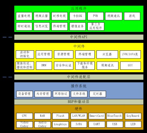 第三個(gè)中間件的可移植性可擴(kuò)展性。芯片廠家或第三方廠家提供的解決方案主要包括:硬件解決方案;實(shí)時(shí)操作系統(tǒng)層,包括了設(shè)備/網(wǎng)絡(luò)驅(qū)動(dòng)、文件系統(tǒng)、圖形/字體驅(qū)動(dòng)、網(wǎng)絡(luò)協(xié)議;瀏覽器模塊,其他模塊需要機(jī)頂盒制造廠家進(jìn)行研發(fā),而這些正是競(jìng)爭(zhēng)差異和難度所在。產(chǎn)業(yè)要做大,就需要更多的廠家進(jìn)入。理想的中間件客戶(hù)端基于操作系統(tǒng)層和硬件;使得更多的缺乏固網(wǎng)技術(shù)經(jīng)驗(yàn)的廠家能夠加入到機(jī)頂盒產(chǎn)業(yè)鏈中,專(zhuān)注于機(jī)頂盒基礎(chǔ)研發(fā)和生產(chǎn),使得中間件移植的難度最小、時(shí)間最短