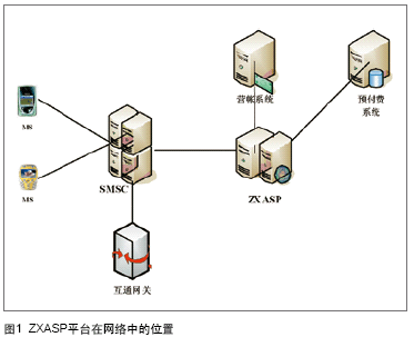 ZXASP:中興短消息增值業(yè)務(wù)平臺,是一個(gè)位于SMSC后端的增值業(yè)務(wù)邏輯控制處理網(wǎng)元,它為用戶提供新型短信增值業(yè)務(wù)開戶、銷戶以及業(yè)務(wù)使用流程控制支持等相關(guān)功能。核心網(wǎng)元ZXASP分別與短信中心、營帳系統(tǒng)以及預(yù)付費(fèi)系統(tǒng)進(jìn)行連接,以實(shí)現(xiàn)對用戶簽約多種增值業(yè)務(wù)情況下的服務(wù)支持。如圖1。
