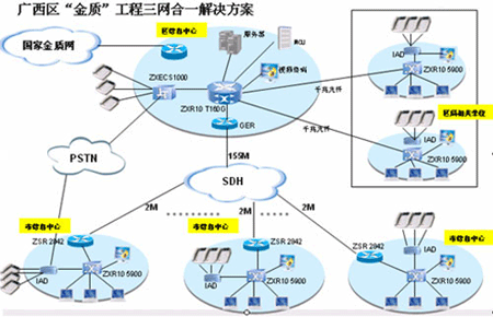 根據(jù)國家“金質(zhì)工程”五年規(guī)劃,結(jié)合廣西壯族自治區(qū)質(zhì)量技術(shù)監(jiān)督局實(shí)際情況,廣西“金質(zhì)工程”(一期)的建設(shè)目標(biāo)非常明確:以區(qū)質(zhì)監(jiān)局為核心,連接3個(gè)下屬研究院、14個(gè)地市質(zhì)監(jiān)局和1個(gè)產(chǎn)品質(zhì)監(jiān)院的質(zhì)監(jiān)業(yè)務(wù)專網(wǎng),支持?jǐn)?shù)據(jù)、語音和視頻業(yè)務(wù)的統(tǒng)一系統(tǒng)平臺(tái)。并以此平臺(tái)為基礎(chǔ),實(shí)現(xiàn)多業(yè)務(wù)的綜合接入,如質(zhì)監(jiān)信息的建立、管理、查詢,以及IP語音、視頻會(huì)議等。