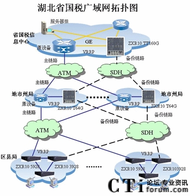 湖北省國稅三級(jí)專網(wǎng)已經(jīng)建成,但是存在單點(diǎn)單鏈路隱患,為了保證網(wǎng)絡(luò)可靠運(yùn)行,2006年湖北國稅攜手中興通訊對(duì)省國稅系統(tǒng)的網(wǎng)絡(luò)進(jìn)行備份網(wǎng)絡(luò)改造,結(jié)合稅務(wù)系統(tǒng)金稅三期網(wǎng)絡(luò)需求,網(wǎng)絡(luò)改造采用SDH線路來組建高帶寬的廣域網(wǎng)絡(luò),同時(shí)與原有的網(wǎng)絡(luò)設(shè)備(包括路由器、交換機(jī))及網(wǎng)絡(luò)接入設(shè)備實(shí)現(xiàn)互連互通,互為備份。