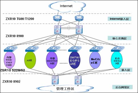 寬帶數(shù)據(jù)承載網(wǎng)主要考慮的是保證網(wǎng)絡(luò)的高可靠性(整體網(wǎng)絡(luò)結(jié)構(gòu)全冗余和設(shè)備的全冗余配置)、高可擴(kuò)展性(核心交換設(shè)備具有大容量特性和網(wǎng)絡(luò)結(jié)構(gòu)的易于拓展)、分層網(wǎng)絡(luò)結(jié)構(gòu)和高可用性。中興的解決方案中,整個(gè)網(wǎng)絡(luò)分成四個(gè)部分:Internet接入層、核心交換層、接入層、后臺(tái)管理區(qū)。