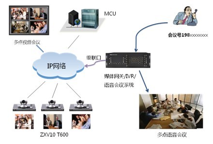 在現(xiàn)有視頻會議網(wǎng)絡基礎上新增語音網(wǎng)關設備,主要負責PSTN、移動網(wǎng)和IP網(wǎng)絡的信令轉(zhuǎn)接、音頻編碼的轉(zhuǎn)換、多點純語音會議、IVR會議引導。
