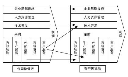 企業(yè)的主要活動都是具有相應(yīng)價值的,這些活動構(gòu)成了企業(yè)的價值鏈,企業(yè)價值鏈首先表現(xiàn)為企業(yè)內(nèi)部的聯(lián)系和支撐,各種活動相互配合,才能產(chǎn)生價值和利潤;其次,企業(yè)的活動和上游供貨商和下游用戶緊密聯(lián)系,相互影響。顯然,供貨商、用戶的各種活動方式能夠直接或者間接地影響企業(yè)的成本、利潤和競爭優(yōu)勢,同樣,企業(yè)的各種活動也將對它們產(chǎn)生很大的影響。