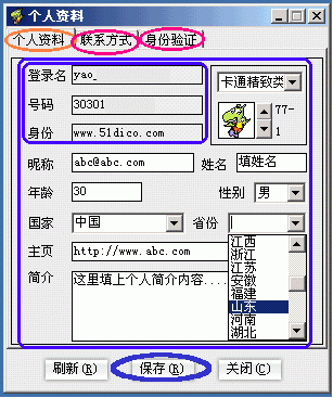 、冱c按"個人資料"命令(圖3的B1處),彈出"個人資料"修改窗口,包括"個人資料/聯(lián)系方式/身份驗證"這三大類選項卡。其中:"個人資料"選項卡下,除登錄名、號碼和身份這三項不可更改外,其余各項都是可填或可選項,據(jù)你所需進行修改就是了(下圖4)。另外,還有"聯(lián)系方式"和"身份驗證"兩大選項,怎么個用法自己點開一看就明白了你!