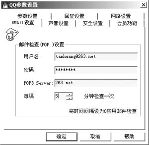 IM和E-mail是我們在網(wǎng)上最常用的兩種工具,如今不少IM軟件將兩者作了完美的結(jié)合。在QQ中你可以直接給自己的好友發(fā)郵件,而無須再輸入E-mail地址;此外對于自己的信箱QQ還有檢查新郵件功能,在“系統(tǒng)參數(shù)”中設(shè)置您自己的E-mail,填好POP3地址,您可以選擇定時檢查時間,QQ就會自動檢查有否新郵件到達(dá)。對于MSN
