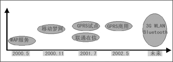 2000年5月,中國(guó)移動(dòng)推出了WAP服務(wù),但是由于準(zhǔn)備不足,加之中國(guó)移動(dòng)沒(méi)有完全轉(zhuǎn)變經(jīng)營(yíng)理念,使得WAP服務(wù)沒(méi)有達(dá)到預(yù)期的發(fā)展目標(biāo)。在吸取WAP服務(wù)的經(jīng)驗(yàn)、教訓(xùn)后,中國(guó)移動(dòng)于2000年11月又推出了“移動(dòng)夢(mèng)網(wǎng)”計(jì)劃。在這次的業(yè)務(wù)推廣中,短消息受到了人們的寵愛(ài),發(fā)展到現(xiàn)在,SMS已經(jīng)深入多數(shù)移動(dòng)用戶(hù)的心中。2001年7月,中國(guó)聯(lián)通也推出了“聯(lián)通在信”與“移動(dòng)夢(mèng)網(wǎng)”進(jìn)行競(jìng)爭(zhēng)(如圖1所示)。與此同時(shí),中國(guó)移動(dòng)又開(kāi)始了GPRS的試點(diǎn)工作,經(jīng)過(guò)近一年時(shí)間,“聯(lián)通在信”并沒(méi)有取得更好的成績(jī),而中國(guó)移動(dòng)的GPRS終于開(kāi)始正式商用。那么,未來(lái)的移動(dòng)數(shù)據(jù)業(yè)務(wù)將依托什么來(lái)發(fā)展呢?是3G,還是WLAN、藍(lán)牙?大家只能拭目以待。
