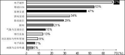 到底有多少人需要移動(dòng)數(shù)據(jù)業(yè)務(wù)呢?有資料顯示,當(dāng)前有36%的人對(duì)移動(dòng)數(shù)據(jù)業(yè)務(wù)處于觀望狀態(tài),只要移動(dòng)數(shù)據(jù)業(yè)務(wù)發(fā)展得好,他們肯定會(huì)加入進(jìn)來(lái)。我們相信,現(xiàn)在已經(jīng)有一定比例的人開(kāi)始從觀望狀態(tài)加入使用移動(dòng)數(shù)據(jù)業(yè)務(wù)的行列中來(lái)。如圖2所示,在用戶(hù)需求中,電子郵件占67%,娛樂(lè)性的業(yè)務(wù)也占有較高的比例,新聞、信息類(lèi)其次。這些數(shù)據(jù)說(shuō)明,人們使用移動(dòng)數(shù)據(jù)業(yè)務(wù),大部分的習(xí)慣是沿襲互聯(lián)網(wǎng)的,這也為移動(dòng)網(wǎng)絡(luò)與互聯(lián)網(wǎng)的結(jié)合奠定了用戶(hù)基礎(chǔ)。