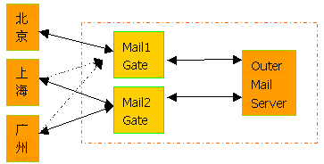 1.正常工作時(shí)北京的內(nèi)部郵件服務(wù)器通過Mail1 Gate與外部郵件服務(wù)器通訊,上海、廣州通過 Mail2 Gate與外部郵件服務(wù)器通訊;