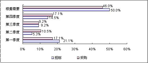 賽迪顧問針對(duì)視頻會(huì)議終端系統(tǒng)用戶招標(biāo)與采購(gòu)的調(diào)查表明,用戶招標(biāo)與采購(gòu)的季節(jié)性差異比較明顯,除了將近50%的用戶會(huì)根據(jù)需要在不確定的時(shí)間里進(jìn)行招標(biāo)和采購(gòu)以外,第一季度和第四季度成為用戶招標(biāo)和采購(gòu)相對(duì)集中的時(shí)間段,這與許多其他商用IT產(chǎn)品的采購(gòu)類似。具體到招標(biāo)和采購(gòu)的月份,10月份成為最為集中的時(shí)間。原因在于,視頻會(huì)議終端系統(tǒng)的采購(gòu)受行業(yè)用戶的資金規(guī)劃與使用的影響顯著。第一季度往往是各企事業(yè)單位資金充裕的時(shí)期,到了第四季度又是政府部門為完成本年度信息化建設(shè)的任務(wù),往往產(chǎn)生比較集中的設(shè)備采購(gòu)。
