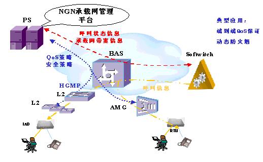 所有用戶接入BAS,BAS通過CAR可以對不同的用戶限制帶寬,PC分配較低的優(yōu)先級及帶寬,而對IAD分配較高的優(yōu)先級和帶寬,防止普通用戶對帶寬的無節(jié)制濫用。PS可以動(dòng)態(tài)收集BAS設(shè)備的帶寬使用情況,同時(shí)通過與軟交換的交互,了解NGN業(yè)務(wù)的帶寬需求,從而在BAS上可按用戶及業(yè)務(wù)的粒度進(jìn)行動(dòng)態(tài)QoS策略配置,為用戶提供差異性業(yè)務(wù),保證用戶的SLA。PS可以下發(fā)QoS策略給BAS,BAS交換機(jī)可以進(jìn)一步通過協(xié)議(各廠家私有協(xié)議)下發(fā)QoS策略給下掛的L2交換機(jī)。