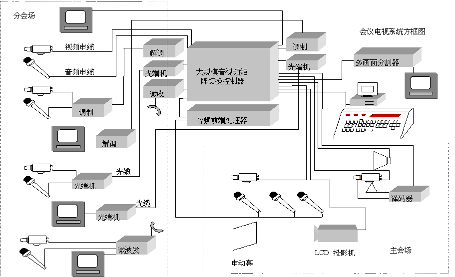 會議主機實現(xiàn)分會場和主會場的電視信號的交互切換,將各個分會場的電視信號送到液晶投影儀上顯示,采用液晶投影儀作大屏幕顯示在電視墻顯示方式,投資小,設有閃爍感,使主會場人員的視覺更舒適(參見系統(tǒng)圖)。