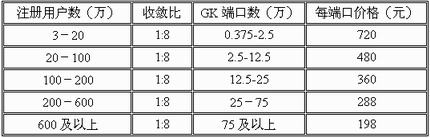 價格初期為720元/端口,后期逐年下降,每年為前期的80%。當(dāng)前GK端口價格以下表為依據(jù):