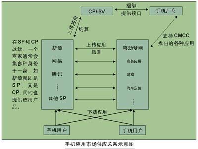 在這樣一個(gè)全新的銷售模式下,運(yùn)營(yíng)商的作用也越發(fā)凸顯出來。“夢(mèng)網(wǎng)是一個(gè)大的平臺(tái),SP是個(gè)小平臺(tái),SP再通過與CP建立合作,進(jìn)而將整個(gè)應(yīng)用市場(chǎng)與終端連接起來,F(xiàn)在,我們?nèi)康膽?yīng)用都放到夢(mèng)網(wǎng)上面了!北本﹫(bào)童電子商務(wù)公司的一個(gè)工作人員說。移動(dòng)夢(mèng)網(wǎng)的建立,事實(shí)上在手機(jī)廠商、應(yīng)用開發(fā)商、用戶三者之間搭了一個(gè)橋梁,將各種手機(jī)應(yīng)用集中在一個(gè)門戶網(wǎng)站,用戶需要時(shí),只需登陸到夢(mèng)網(wǎng)上面,點(diǎn)擊相關(guān)的網(wǎng)頁,就可隨時(shí)下載所需要的應(yīng)用。