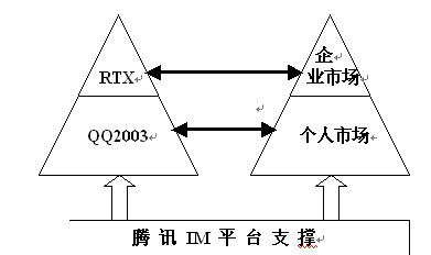 1、從QQ2003到RTX是對IM市場的全方位介入。騰訊推出革命性的QQ2003,緊接著又啟動(dòng)RTX新品牌進(jìn)軍企業(yè)市場,標(biāo)志著其不滿足于將自身定位為娛樂及時(shí)信息平臺(tái)和服務(wù)提供商,而是對商務(wù)市場和個(gè)人市場進(jìn)行理性細(xì)分后的一種戰(zhàn)略決策,向兩類不同的用戶推出不同的品牌,提供不同的服務(wù)(如下圖),既保證了不同用戶的需求特質(zhì),又有效避免了品牌混亂。