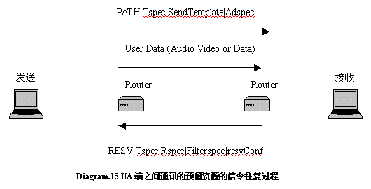 發(fā)送方發(fā)送PATH消息,消息中包含有數(shù)據(jù)業(yè)務(wù)特征,該消息沿所選的路徑傳送,沿途的路由器按照PATH準(zhǔn)備路由資源,接收方接收到PATH消息以后,根據(jù)業(yè)務(wù)特征和所需要的QOS計(jì)算出所需要的資源,回送RESV消息,消息中包含的參數(shù)就包括請(qǐng)求預(yù)留的帶寬,延PATH的原路途返回,沿途的路由器接收到RESV操作后才執(zhí)行資源預(yù)留操作。發(fā)送方接收到RESV消息以后才發(fā)送用戶(hù)數(shù)據(jù)。