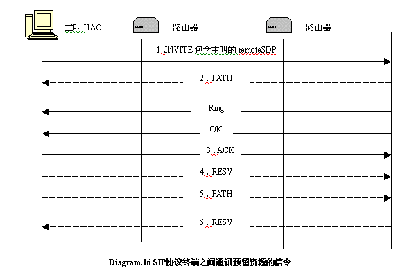 在上圖中實(shí)線(xiàn)的部分是SIP命令,虛線(xiàn)部分是RSVP消息