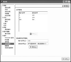 文本替換:根據用戶自定義的規(guī)則替換發(fā)出的消息,其實差不多類似于縮寫功能,你可以把一段話定義成一個字母,以后只要輸入這個字母,就會直接顯示這段話了。比如在缺省設置下,輸入“r”即可送出“are”,輸入“u”即可送出“you”(如圖7)。