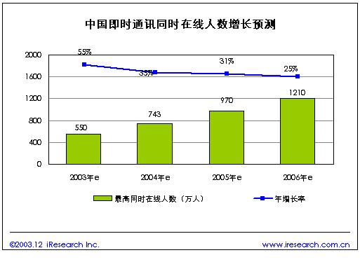 我們預(yù)計(jì)未來(lái)隨著中國(guó)上網(wǎng)人口的增長(zhǎng),以及IM軟件的不斷普及,即時(shí)通訊在線人數(shù)將保持快速增長(zhǎng)。預(yù)計(jì)2004年國(guó)內(nèi)IM最高同時(shí)在線人數(shù)有望突破740萬(wàn)人,到2006年將突破1200萬(wàn)人同時(shí)在線。