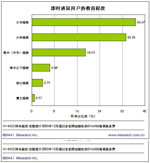 從即時(shí)通訊用戶的學(xué)歷水平來(lái)分析,在目前的即時(shí)通訊用戶中,大專(zhuān)以上教育程度的用戶比例達(dá)到了75%,占據(jù)了絕對(duì)高的比例。顯示出即時(shí)通訊用戶的整體教育水平非常高。