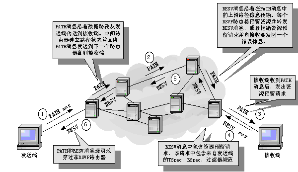 Int-Serv/RSVP服務(wù)模型在IETF RFC1633中進行了定義。RFC1633將資源預留協(xié)議RSVP作為IntServ結(jié)構(gòu)中的主要信令協(xié)議。其基本思想就在于以資源預留的方式來實現(xiàn)QoS保障,RSVP是其核心部分。RSVP是主機用來從應(yīng)用程序獲得特定的QoS的一種控制協(xié)議,完成綜合服務(wù)需要定義的呼叫接納控制功能和資源預留功能。端點應(yīng)用程序利用RSVP消息向網(wǎng)絡(luò)提出完成數(shù)據(jù)傳送必須保留的網(wǎng)絡(luò)資源(如帶寬及緩沖區(qū)大小等),同時也確定沿傳送路徑的各個節(jié)點傳輸處理策略,從而對每個業(yè)務(wù)流實現(xiàn)逐個控制。