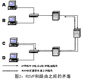 IntServ/RSVP還存在著資源預留和路由協(xié)議之間的矛盾。如圖2所示,從路由角度來看它是一條好的路徑,但從資源預留來看,由于沒有足夠的資源可以預留,不能為數(shù)據(jù)流建立起一條路徑,因此這一進程只能停留在這里,等待上層超時拆除這個應(yīng)用進程,再重新建立路徑。