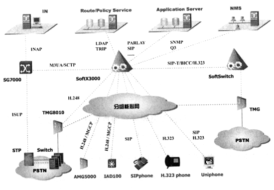 總之,基于IP軟交換的網(wǎng)絡(luò)是一個融合網(wǎng)絡(luò),包括PSTN/ISDN、H.323、ATM/IP等各種網(wǎng)絡(luò)。SIP協(xié)議是NGN多媒體通信協(xié)議,用于軟交換、SIP服務(wù)器和SIP終端之間的通信控制和信息交互,擴展的SIP-T可使SIP消息攜帶ISUP信令;在需要媒體轉(zhuǎn)換的地方可設(shè)置媒體網(wǎng)關(guān),H.248/Megaco為媒體網(wǎng)關(guān)控制器(MGC),用于控制媒體網(wǎng)關(guān),完成媒體轉(zhuǎn)換功能,它并不負責(zé)呼叫控制功能;H.323也是多媒體通信協(xié)議,它比SIP、H.248/Megaco的發(fā)展歷史更長,是一項復(fù)雜的協(xié)議,升級和擴展性不是很好,SIP+H.248/Megaco可取代H.323,為了與H.323網(wǎng)絡(luò)互通,NGN必須支持該項協(xié)議;SIGTRAN用于解決IP網(wǎng)絡(luò)承載七號信令的問題,它允許七號信令穿過IP網(wǎng)絡(luò)到達目的地;BICC可使ISUP協(xié)議在不同承載網(wǎng)絡(luò)(ATM、IP、PSTN)上傳送。