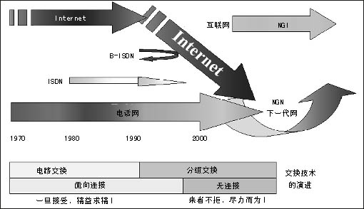 傳統(tǒng)電信網(wǎng)和互聯(lián)網(wǎng)都面臨著挑戰(zhàn),基于電話業(yè)務(wù)設(shè)計(jì)的電路交換網(wǎng)不能靈活適應(yīng)帶寬各異的數(shù)據(jù)業(yè)務(wù)的發(fā)展。專(zhuān)為數(shù)據(jù)業(yè)務(wù)設(shè)計(jì)的互聯(lián)網(wǎng)則存在著安全性、可管理性、商業(yè)模式等問(wèn)題的困擾。NGI對(duì)目前電信網(wǎng)的主要盈利業(yè)務(wù)語(yǔ)音的質(zhì)量保證以及對(duì)電信網(wǎng)增長(zhǎng)空間很大的業(yè)務(wù)(移動(dòng))關(guān)注不夠。NGI可能達(dá)到的目標(biāo)不能滿足電信界的需要。因此,在NGI之后ITU和ETSI等提出了更高的目標(biāo)——NGN,這就是NGN的提出背景。信息產(chǎn)業(yè)部電信研究院科技委副主任委員雷震洲認(rèn)為,兩大亮點(diǎn)點(diǎn)燃了NGN:一是數(shù)據(jù)超過(guò)語(yǔ)音的信息需求,全球互聯(lián)網(wǎng)用戶目前已逾7億,全世界在網(wǎng)上傳送的以IP為代表的數(shù)據(jù)業(yè)務(wù)量已經(jīng)超過(guò)語(yǔ)音業(yè)務(wù)量;二是移動(dòng)超過(guò)固定的個(gè)性化需求,全球移動(dòng)用戶已經(jīng)超過(guò)13億,近100個(gè)國(guó)家的移動(dòng)用戶數(shù)已經(jīng)超過(guò)固定用戶數(shù),我國(guó)在2003年10月移動(dòng)用戶也超過(guò)了固定用戶數(shù)。