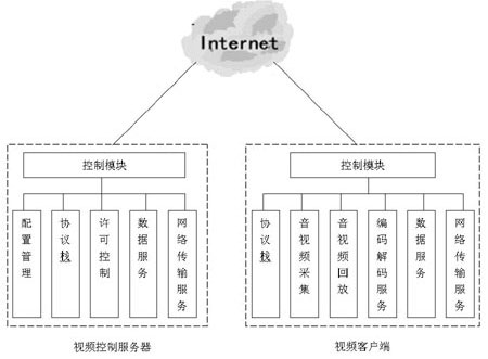 視頻會(huì)議系統(tǒng)一般由視頻控制服務(wù)器、會(huì)議客戶(hù)端軟件以及IP傳輸網(wǎng)絡(luò)系統(tǒng)組成(如圖1所示)。