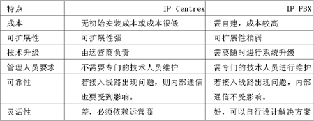 運營商自然不會聽之任之,因此推出了IP Centrex業(yè)務(wù)與其相抗衡。由附表可以很明顯地看出,與IP PBX相比,IP Centrex的優(yōu)勢有:初期投入成本小、以辦公費用方式容易控制現(xiàn)金流;無須對網(wǎng)絡(luò)、業(yè)務(wù)平臺進行維護;平臺規(guī)模與公司規(guī)模同步增長;具有對公網(wǎng)的開放性;辦公地點的任意性、易擴展;使企業(yè)集中在主營業(yè)務(wù)領(lǐng)域;業(yè)務(wù)可擴展性好。