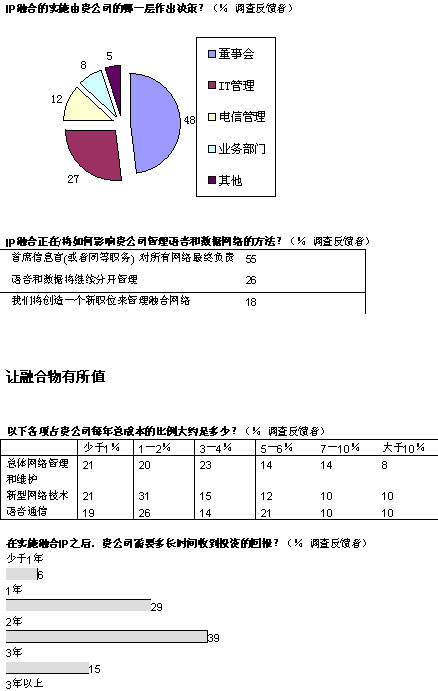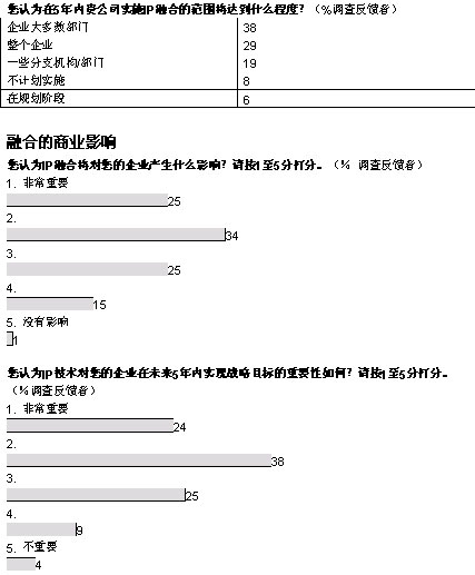 我們調(diào)查的企業(yè)中,有超過(guò)三分之二將在未來(lái)五年內(nèi)實(shí)現(xiàn)大多數(shù)或者所有部門向融合網(wǎng)絡(luò)的轉(zhuǎn)型。大部分企業(yè)采取按部就班的形式在某些特殊部門和業(yè)務(wù)開(kāi)始部署。在融合應(yīng)用中,IP語(yǔ)音電話將在未來(lái)三年內(nèi)吸引大量投資;管理人士期望通過(guò)大幅削減公司內(nèi)部的通話費(fèi)用獲得早期的回報(bào)。在更廣泛的層面上,大多數(shù)管理者預(yù)計(jì),融合網(wǎng)絡(luò)對(duì)其企業(yè)的商業(yè)影響將會(huì)“非常重要”或者“重要”。