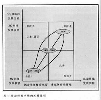 移動網(wǎng)絡和移動終端的發(fā)展將共同決定移動視頻市場的發(fā)展進程,主要包括四個發(fā)展階段,見圖1。