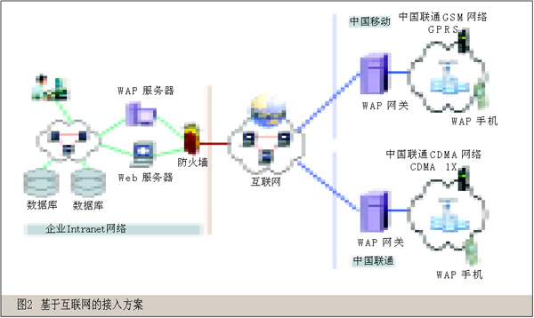 在這種方式中,企業(yè)員工無(wú)論使用GSM還是CDMA制式手機(jī)均可以訪問(wèn)WAP服務(wù)器,即使國(guó)際漫游狀態(tài)也可以通過(guò)當(dāng)?shù)氐?.5G(或2G)網(wǎng)絡(luò)登錄Internet訪問(wèn)企業(yè)的信息,WAP手機(jī)設(shè)置采用運(yùn)營(yíng)商提供的標(biāo)準(zhǔn)設(shè)置,具有較強(qiáng)的技術(shù)通用性。