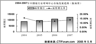 根據(jù)CTI論壇預(yù)測,到2007年,銀行業(yè)呼叫中心的座席總數(shù)將達(dá)到12500個(gè),累計(jì)投資額將達(dá)到70億元。2005年到2007年的投資額復(fù)合年平均增長率為14.86%。未來,銀行業(yè)在未來三年內(nèi)的發(fā)展穩(wěn)定,并以較高速度增長。