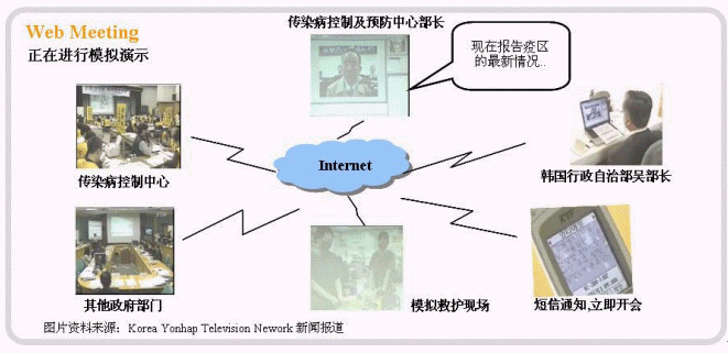 在韓國(guó)已經(jīng)安排多次的模擬演示,當(dāng)疫情在韓國(guó)發(fā)生及蔓延時(shí),由韓國(guó)傳染病控制及預(yù)防中心發(fā)出開(kāi)會(huì)通知,召集其他緊急醫(yī)療機(jī)構(gòu)、專家及政府部門(如行政自治部)等,一起進(jìn)行視像會(huì)議。在會(huì)議上,傳染病控制中心將各地收集回來(lái)的最新情況及報(bào)表共享給參會(huì)人及團(tuán)體。由各專家一起分析現(xiàn)況,進(jìn)行討論、判斷及決定解決辦法及措施。同時(shí)要求其他政府部門協(xié)調(diào)與全力幫助,目的是將疫情在最短的時(shí)間及在最少的范圍內(nèi)得到控制及處理,減少對(duì)人民生命安全及國(guó)家損失的影響。先進(jìn)的通訊科技能加快對(duì)危機(jī)發(fā)生時(shí),政府相關(guān)部門及機(jī)構(gòu)對(duì)事件的了解、分析、處理及決策,準(zhǔn)確傳達(dá)信息、加強(qiáng)信息的交流、提高辦事效率、加快決策速度以及落實(shí)措施及處理方法的執(zhí)行。最重要的事,將各方面的損失降到最低的程度,避免了事情的惡化及波及其他范圍的負(fù)面影響。