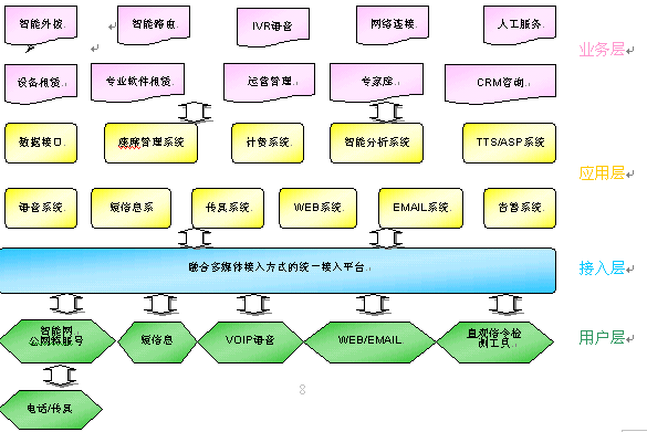 中心系統(tǒng)具備網(wǎng)絡(luò)呼叫中心及靈活的設(shè)備組網(wǎng)方式,必須使用多種媒體結(jié)合技術(shù),平臺能智能處理來自不同媒體的服務(wù)請求。多媒體包含了固定電話、移動電話、傳真、尋呼、短消息、Web、Email、視頻、PDA等多媒體。
