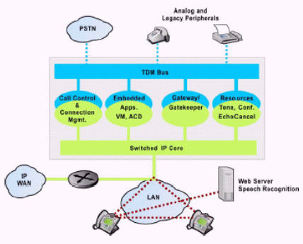 IP Enabled類IP-PBX的核心交換還是基于64K的傳統(tǒng)TDM交換網(wǎng)絡(luò),由一條傳統(tǒng)TDM BUS進(jìn)行控制,IP業(yè)務(wù)的支持需外接網(wǎng)關(guān)(可為內(nèi)置插板或外置模塊),其優(yōu)點(diǎn)與傳統(tǒng)TDM PBX完全相同,缺點(diǎn)是由于核心交換帶寬的限制,無(wú)法實(shí)現(xiàn)與寬帶數(shù)據(jù)網(wǎng)絡(luò)的無(wú)縫集成,IP業(yè)務(wù)支持有限,一般僅為IP Networking和一些簡(jiǎn)單IP桌面設(shè)備,而且網(wǎng)絡(luò)的透明度和IP桌面設(shè)備的功能都不太盡如人意。