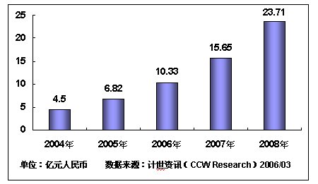 Research)數(shù)據(jù)表明,2005年,我國(guó)移動(dòng)政務(wù)市場(chǎng)規(guī)模達(dá)6.82億元,增長(zhǎng)率為51.6%,預(yù)計(jì)2006年,我國(guó)移動(dòng)政務(wù)市場(chǎng)規(guī)模將達(dá)到10.33億元,預(yù)計(jì)未來(lái)三年內(nèi),中國(guó)移動(dòng)政務(wù)復(fù)合增長(zhǎng)率將達(dá)到51.5%,截至2008年,我國(guó)移動(dòng)政務(wù)市場(chǎng)規(guī)模將突破20億元。