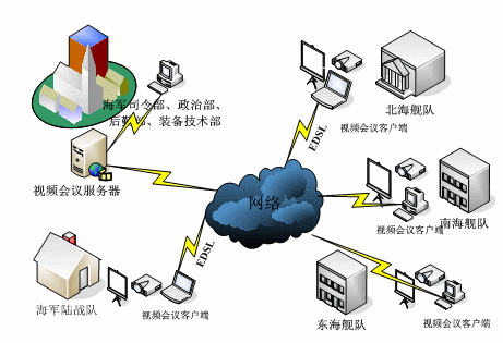 視維視頻會議系統(tǒng)應(yīng)用于海防團(tuán)專網(wǎng)內(nèi),系統(tǒng)由服務(wù)器端軟件和客戶端軟件兩部分組成,為了滿足支持大容量會議人數(shù)、多會議同時召開以及流暢的音視頻交換的要求。視維網(wǎng)絡(luò)視頻會議系統(tǒng)在此方案中將采用1臺高端專用服務(wù)器作為視頻會議服務(wù)器,可容納多點(diǎn)同時開會,以確保系統(tǒng)的穩(wěn)定性和性能要求。,將服務(wù)器放置在主干/核心交換機(jī)上,使服務(wù)器和客戶端的路由/交換性能達(dá)到最佳效果。所有會議成員都需要在其個人計算機(jī)上安裝客戶端軟件。其網(wǎng)絡(luò)拓?fù)鋱D如下: