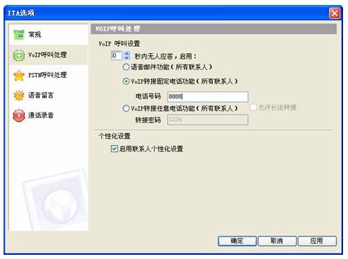 啟動 VoIP呼叫轉(zhuǎn)接固定電話功能,設(shè)置0秒啟動,轉(zhuǎn)接固定電話號碼為交換機內(nèi)置語音引導(dǎo)號8888,如圖,假設(shè)8888是交換機上配置的語音引導(dǎo)號。