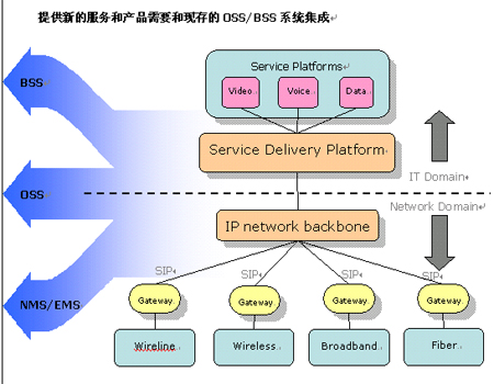 沒(méi)有一家電信公司可以花費(fèi)數(shù)年時(shí)間來(lái)重新開(kāi)發(fā)新的服務(wù),服務(wù)提供商在舊的計(jì)費(fèi),開(kāi)通,網(wǎng)管系統(tǒng)上已經(jīng)進(jìn)行了大量的投資,現(xiàn)存的大量關(guān)鍵系統(tǒng)必須得以重用并平滑過(guò)渡到三網(wǎng)合一時(shí)代。