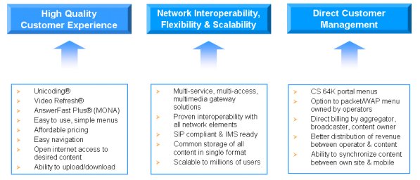 Refresh®和AnswerFast Plus® (MONA的一部分),同時(shí)多媒體網(wǎng)關(guān)解決方案也包括在內(nèi)。其它方面的可互操作性和用戶體驗(yàn)改善問題很容易能解決,對(duì)今天現(xiàn)有的WAP服務(wù)是一種補(bǔ)充。