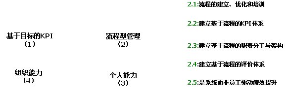 因此,要有效實施“流程型”管理,必須在我們?nèi)粘9芾淼膬?nèi)容、KPI體系、組織架構(gòu)、績效評價體系和組織發(fā)展的驅(qū)動力五個方法實施同步的轉(zhuǎn)變,才能有效建立流程文化,保證整個組織對流程的理解和重視,提高組織的執(zhí)行能力,通過“組織能力”保證組織目標的實現(xiàn),而非依賴個體能力。