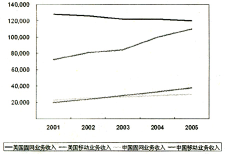 美國與中國固網(wǎng)與移動業(yè)務(wù)收入比較(單位:百萬美元)