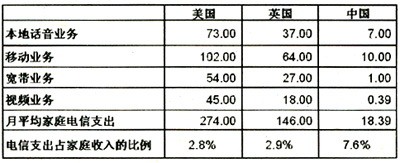 2005年美國、英國和中國電信消費(fèi)支出構(gòu)成比例分析(單位:美元)