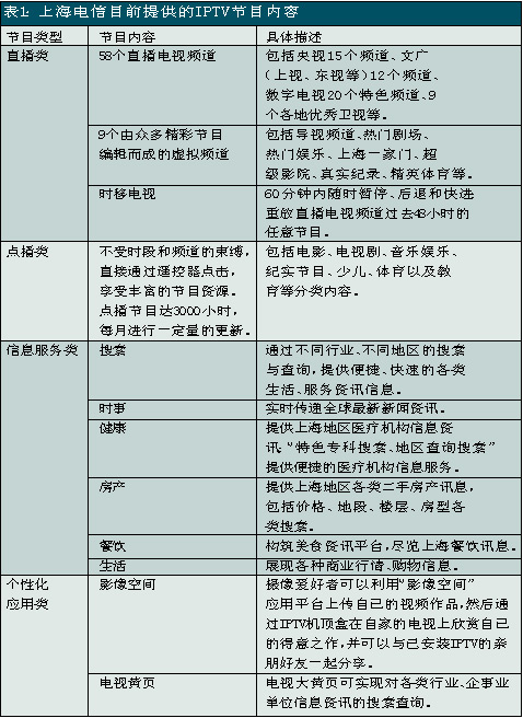 上海電信是國內(nèi)關(guān)注并切入IPTV業(yè)務(wù)較早的電信運(yùn)營商之一,自2005年就開始積極測試和試驗(yàn)。此次上海電信在全上海市范圍內(nèi)推出IPTV業(yè)務(wù),被業(yè)界看作是“中國IPTV規(guī)模商用的新紀(jì)元”。除了影視節(jié)目收看、視頻內(nèi)容點(diǎn)播、時(shí)移功能外,上海電信的IPTV服務(wù)還包括時(shí)事新聞、遠(yuǎn)程醫(yī)療、視頻房產(chǎn)信息、餐飲信息、天氣預(yù)報(bào)、票務(wù)查詢等信息服務(wù)以及可視電話、IPTV游戲等個(gè)性化應(yīng)用。其中IPTV的直播頻道有58個(gè),視頻點(diǎn)播可選節(jié)目量達(dá)3000小時(shí)以上。另外,上海電信還推出了影像空間和電視大黃頁等應(yīng)用服務(wù),攝像愛好者可以利用“影像空間”應(yīng)用平臺上傳自己的視頻作品,然后通過IPTV機(jī)頂盒在自家的電視上欣賞自己的得意之作,并可以與已安裝IPTV的親朋好友一起分享;電視大黃頁可實(shí)現(xiàn)對各類行業(yè)、企事業(yè)單位信息資訊的搜索查詢。