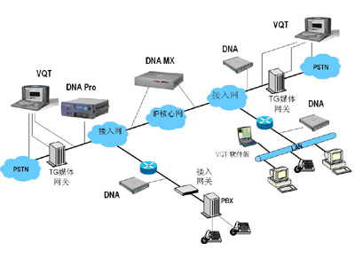 以上兩種測試方法也可以結(jié)合使用,在進行端到端VQT測試時,在NGN網(wǎng)絡(luò)的中間網(wǎng)段(根據(jù)需要可以設(shè)置多個監(jiān)測點)部署分布式網(wǎng)絡(luò)分析儀(DNA),進行被動式RTP/RTCP監(jiān)測,從而判斷出造成語音質(zhì)量下降的環(huán)節(jié)所在。如下圖所示: